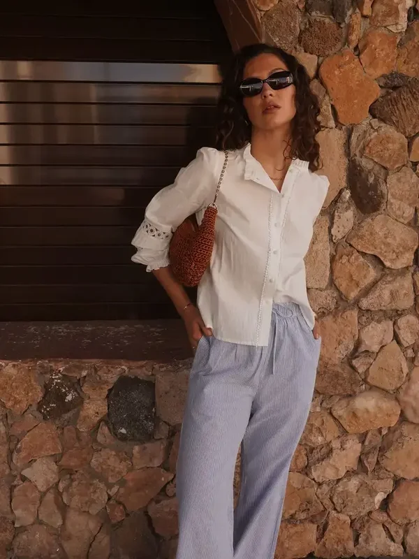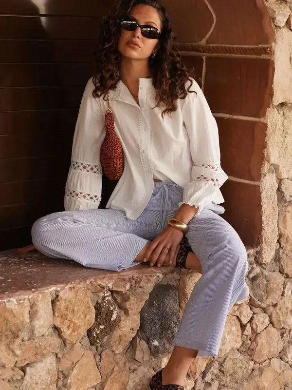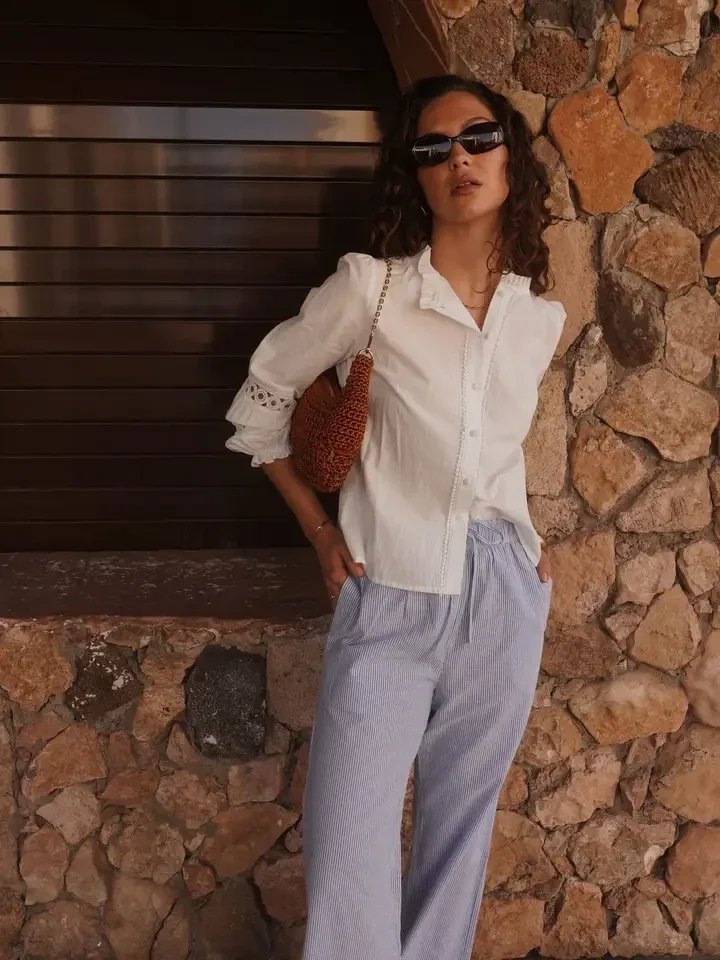* Feine blau-weiße Streifen für einen frischen, sommerlichen Stil Passend zu einer Baumwollbluse für ein boho-chices Outfit oder zu einem taillierten Top für einen strukturierteren Look.