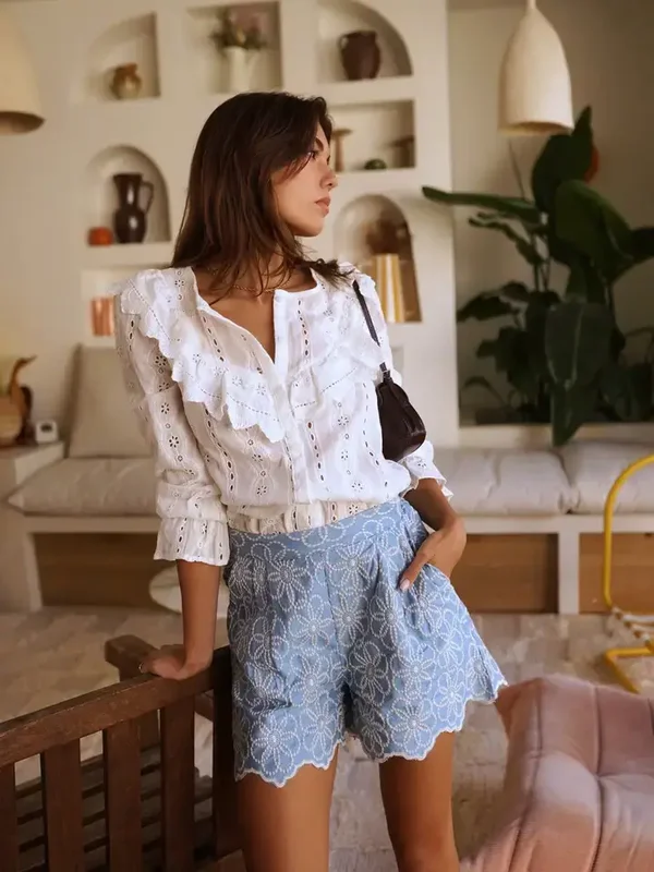 Short aus himmelblauer Baumwollbatist Stickerei, veredelt durch zarte florale Motive und eine festonierte Kante.